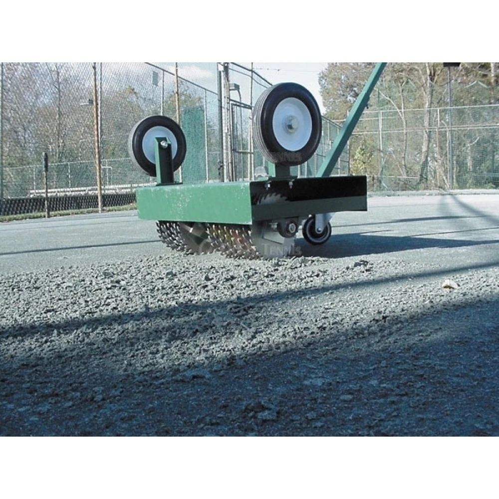 Court scarifier perfectly sized to agitate surfaces along court perimeters and beneath the net line. Circular steel blades mounted on a free-turning axle to agitate court surfaces without removing or damaging existing line tapes.